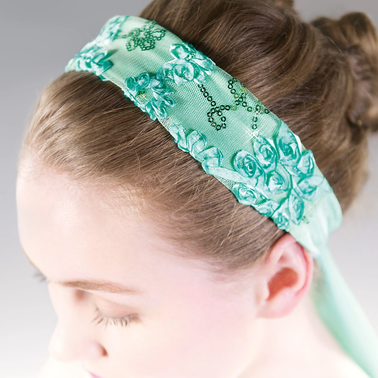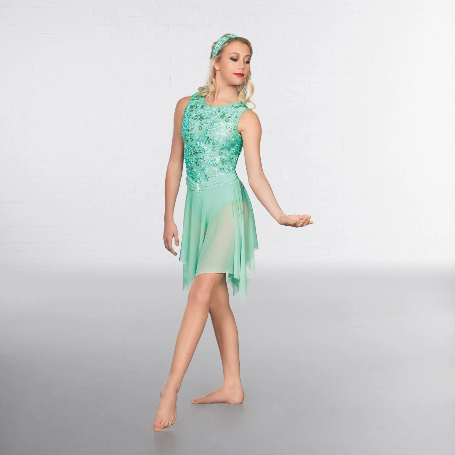 * This dainty, graceful and enchanting lyrical dress is embellished at the front with a delicate ribbon flower and sequin mesh design that comes with a matching head wrap