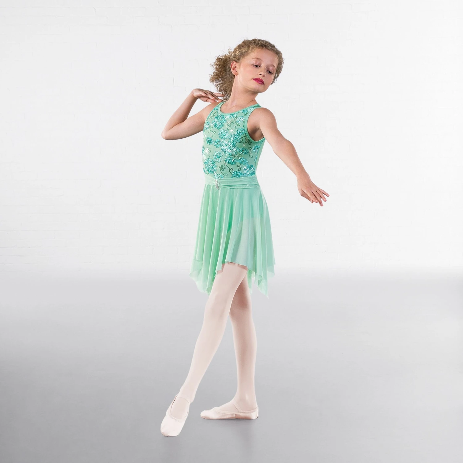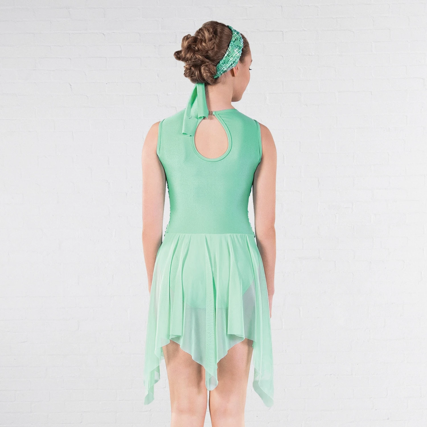 * The hankerchief shaped skirt is made from floaty power mesh. This fabric is also used for the gathered waistband stitched to the leotard in the middle