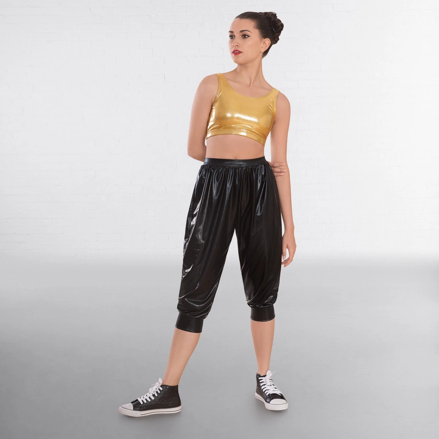 * Show off your attitude with these wet-look harem trousers from 1st Position
