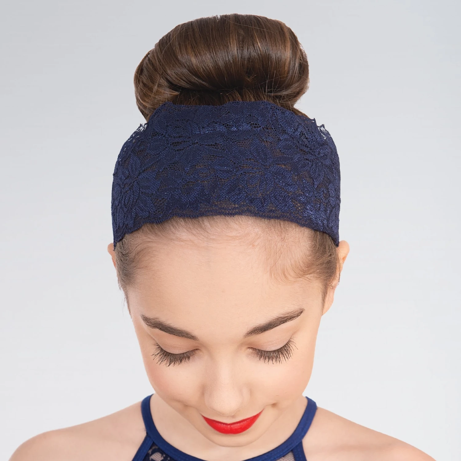 * A headband in matching navy lace finish the look