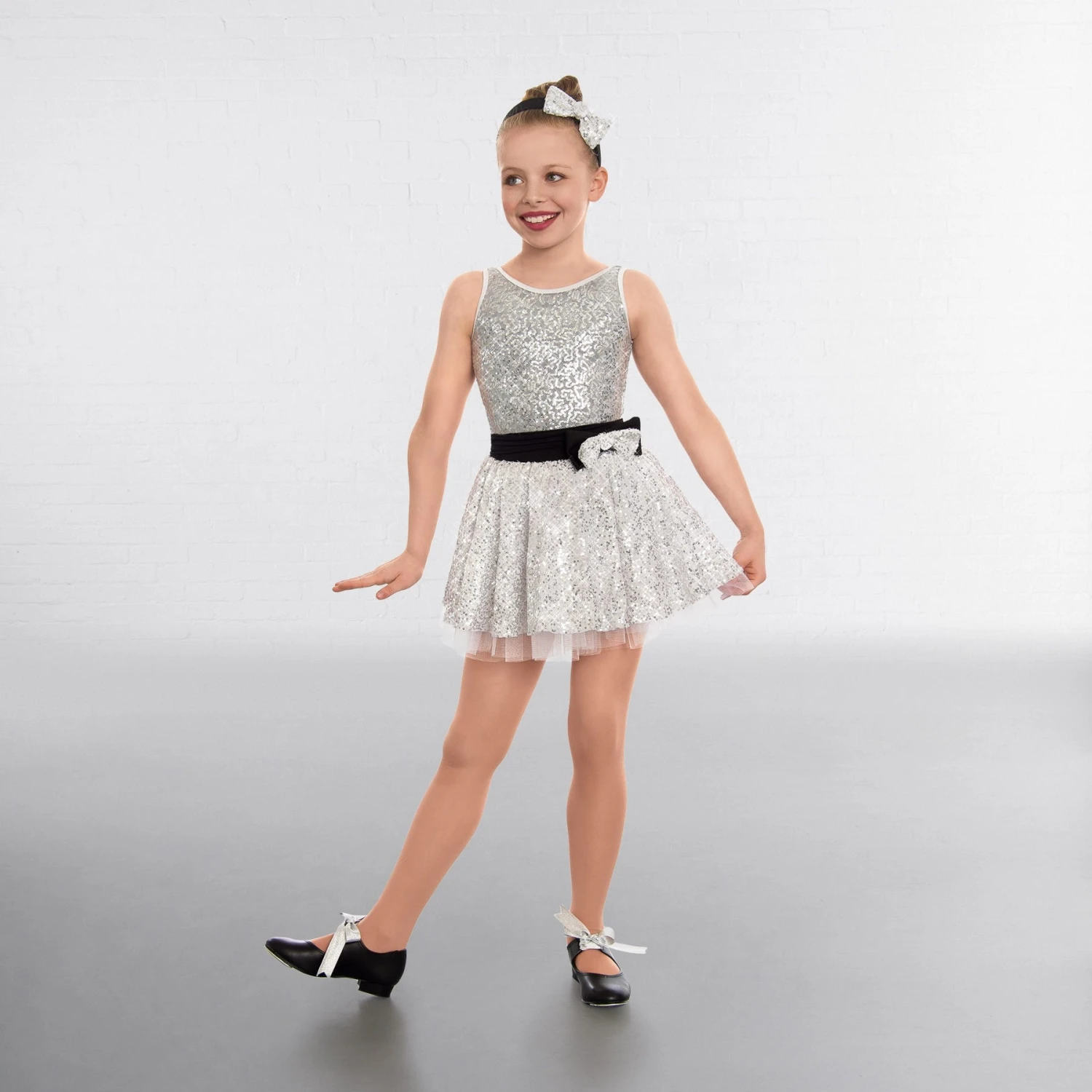 * This costume is replacing W720. This lined bodice sequinned dress is perfect for bringing the bling to any glitz number with a matching bow on a contrasting waistband.