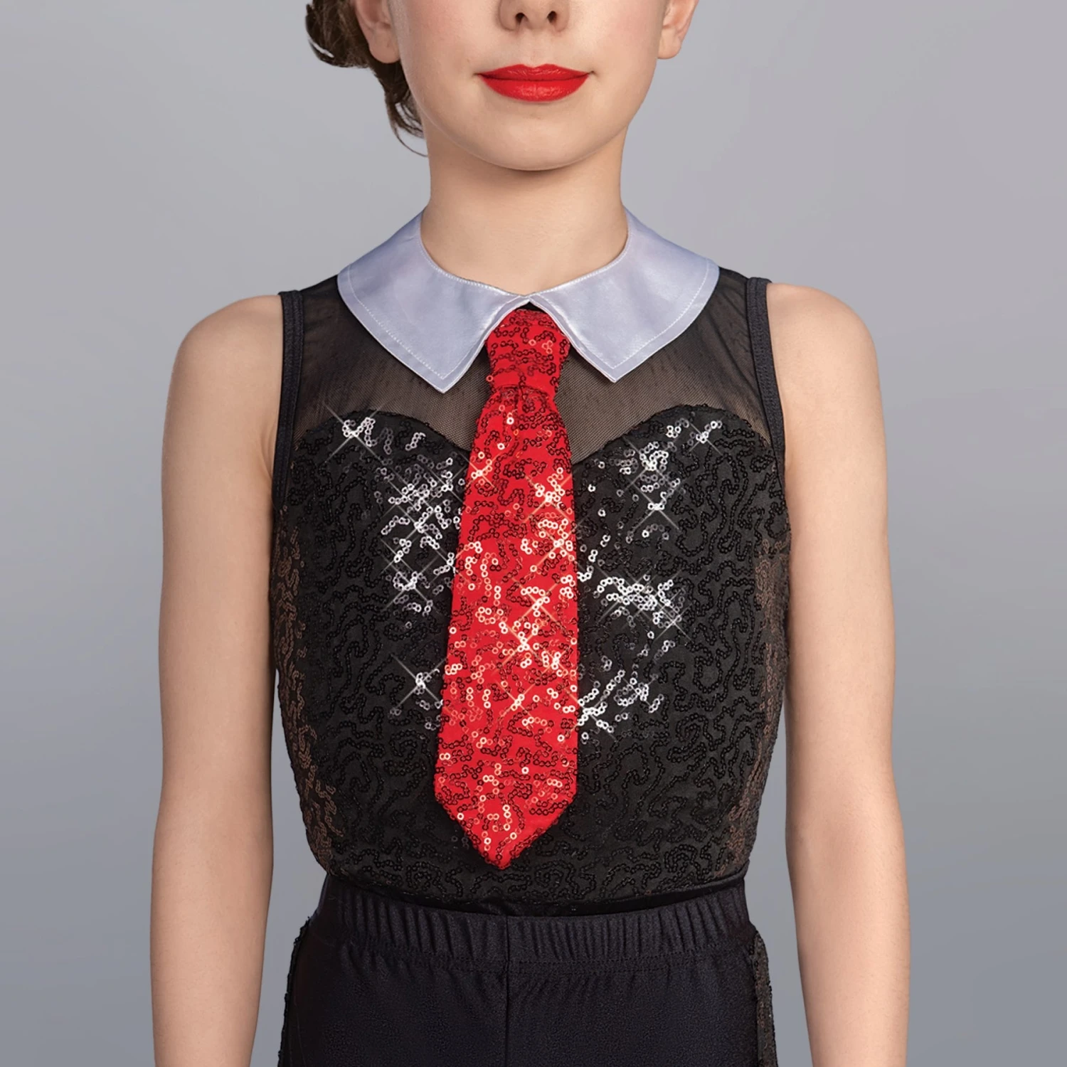 * Comes complete with white satin collar with hook fastening with attached red sequin tie