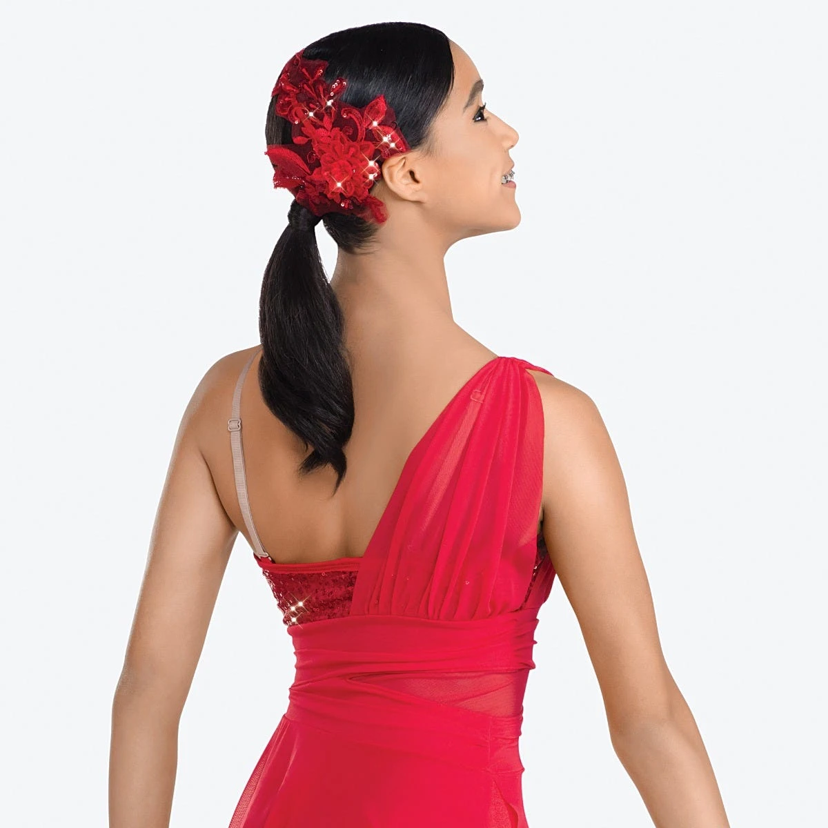 - Sequin appliqué headdress, hair pins, hanger and garment bag included
