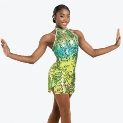 Spandex halter neck leotard with extended bike-shorts leg line, with an attached overdress made from ombré paillette sequin mesh and finished with hologram foil Spandex binding. The back fastens with a clear plastic hook at the neckline and features a keyhole opening mid-back. Comes with detachable, adjustable straps. Includes headpiece, nude and clear adjustable straps, hanger and garment bag.