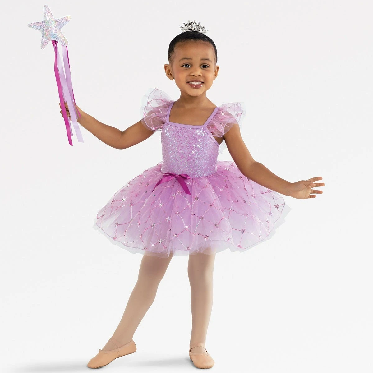 Matte spandex leotard with a sequin spandex overlay has tulle and sequin organza shoulder straps and attached bow at the waist. Skirt is layers of tulle under embroidered sequin organza. Includes mini tiara, wand, hanger and garment bag.