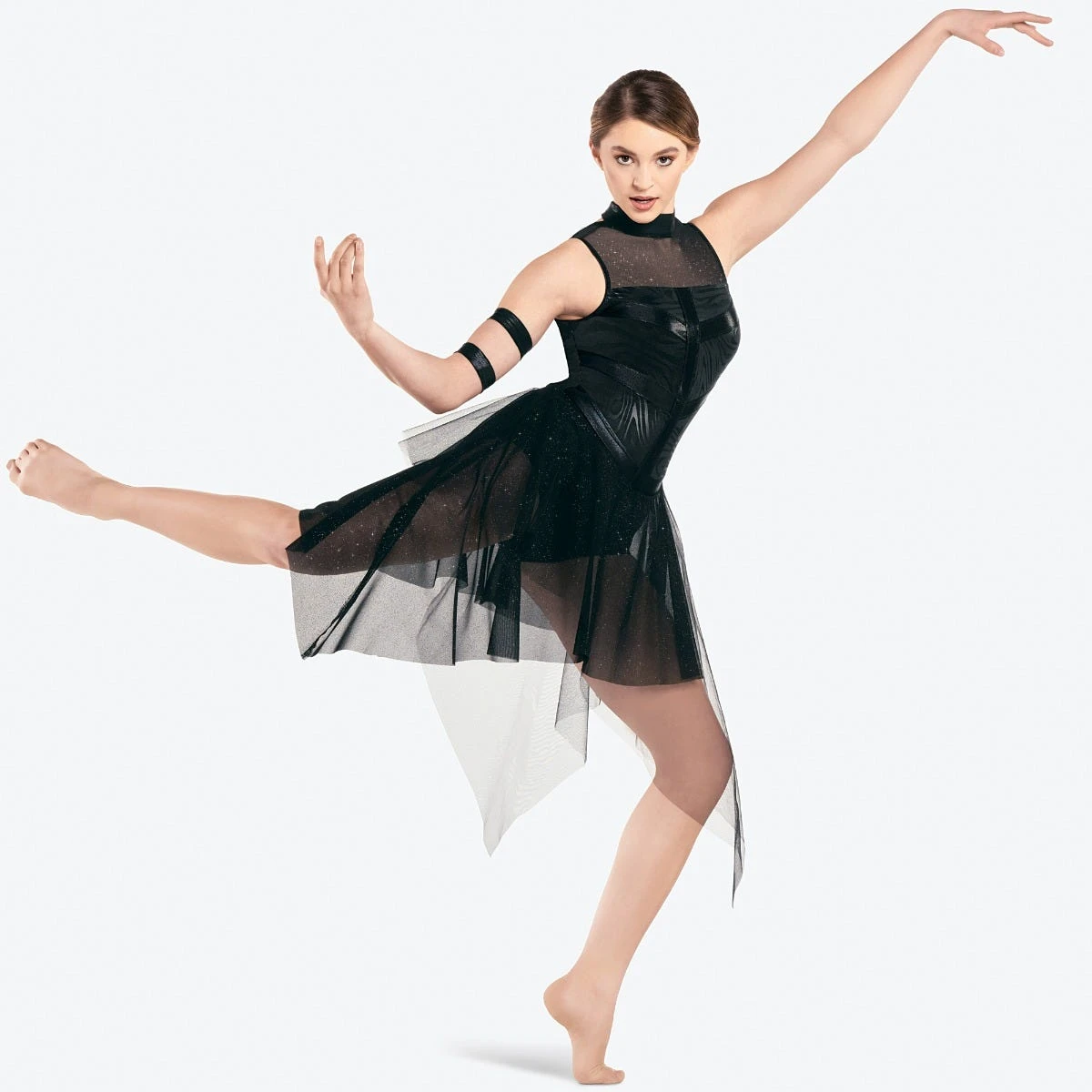 Coated spandex leotard with glitter mesh yoke features strips of foil spandex on bodice and neckline. Attached asymmetrical skirt is a layer of glitter mesh under a layer of tulle. Includes armbands, hanger and garment bag.