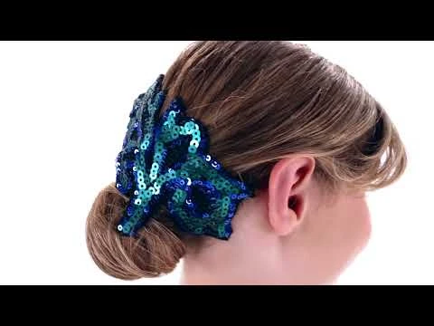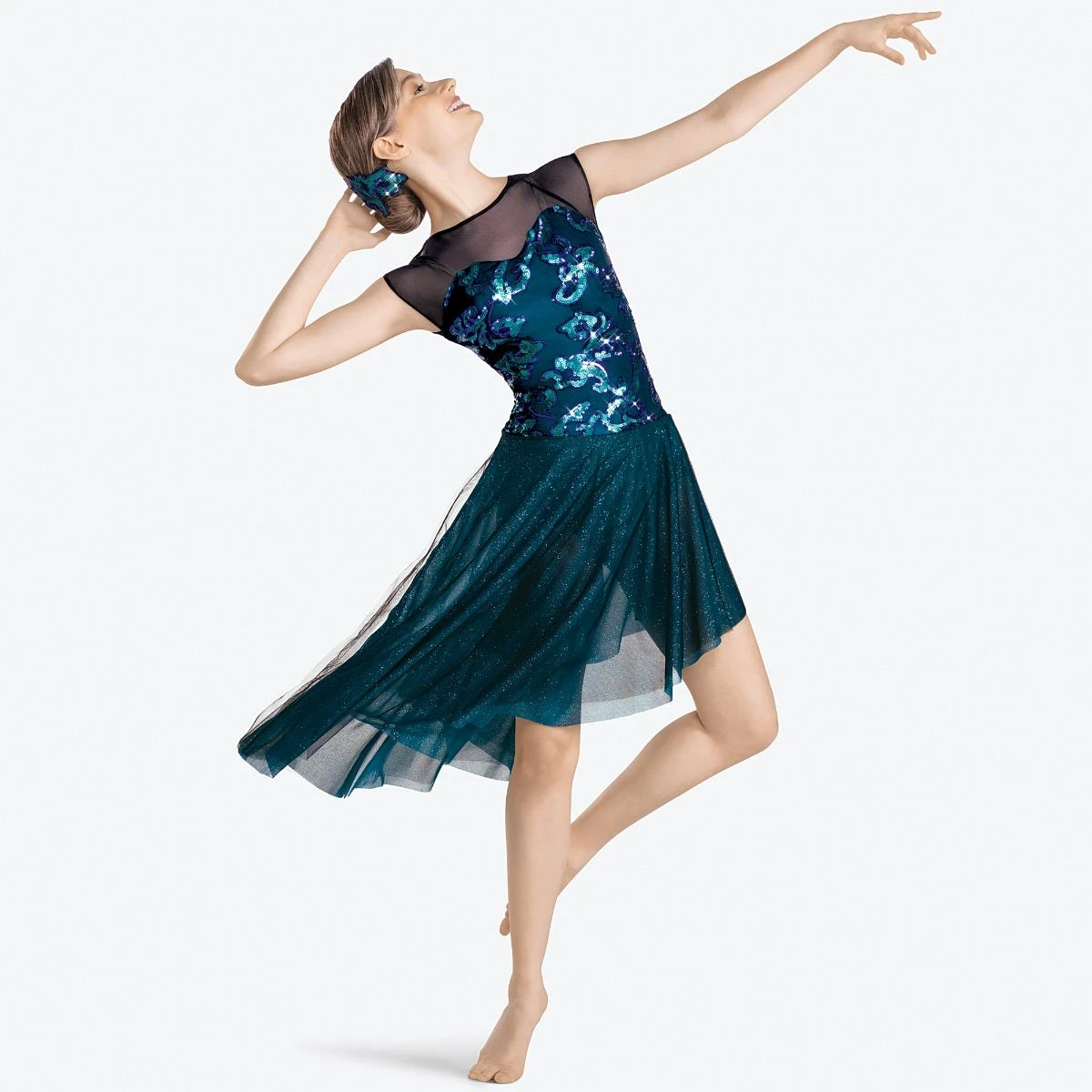 Spandex leotard with sequin mesh overlay has a mesh yoke and attached, adjustable nude shoulder straps. Attached asymmetrical skirt is a layer of glitter mesh under a layer of tulle. Includes headpiece, bobby pins, hanger and garment bag.