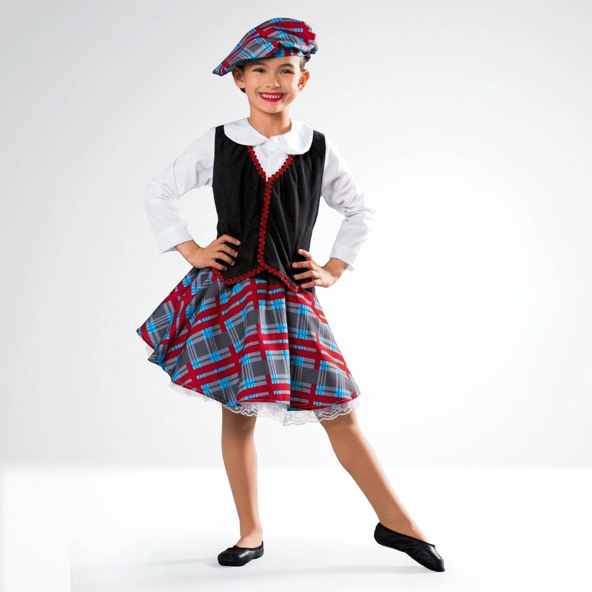 * The waistcoat has attached sleeves and collar and fastens at the front with velcro. This can be worn with trousers for a boy or with the accompanying skirt of plaid over a lace trimmed net underlay. A Scottish bonnet style hat completes the look